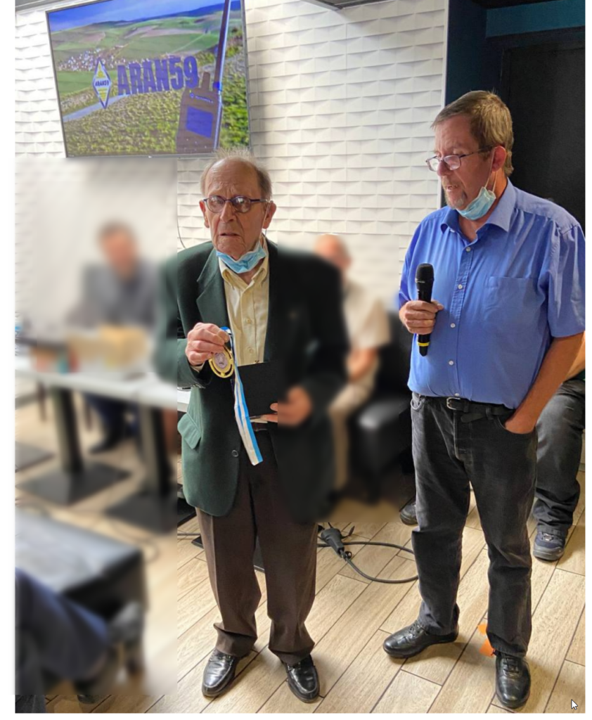 ci-dessous photos prisent à l’AG de l Aran59 en 2021 lors de la remise de la médaille de l’UFT à René F6HSH, Marc-Antoine avait organisé la surprise pour la lui remettre !